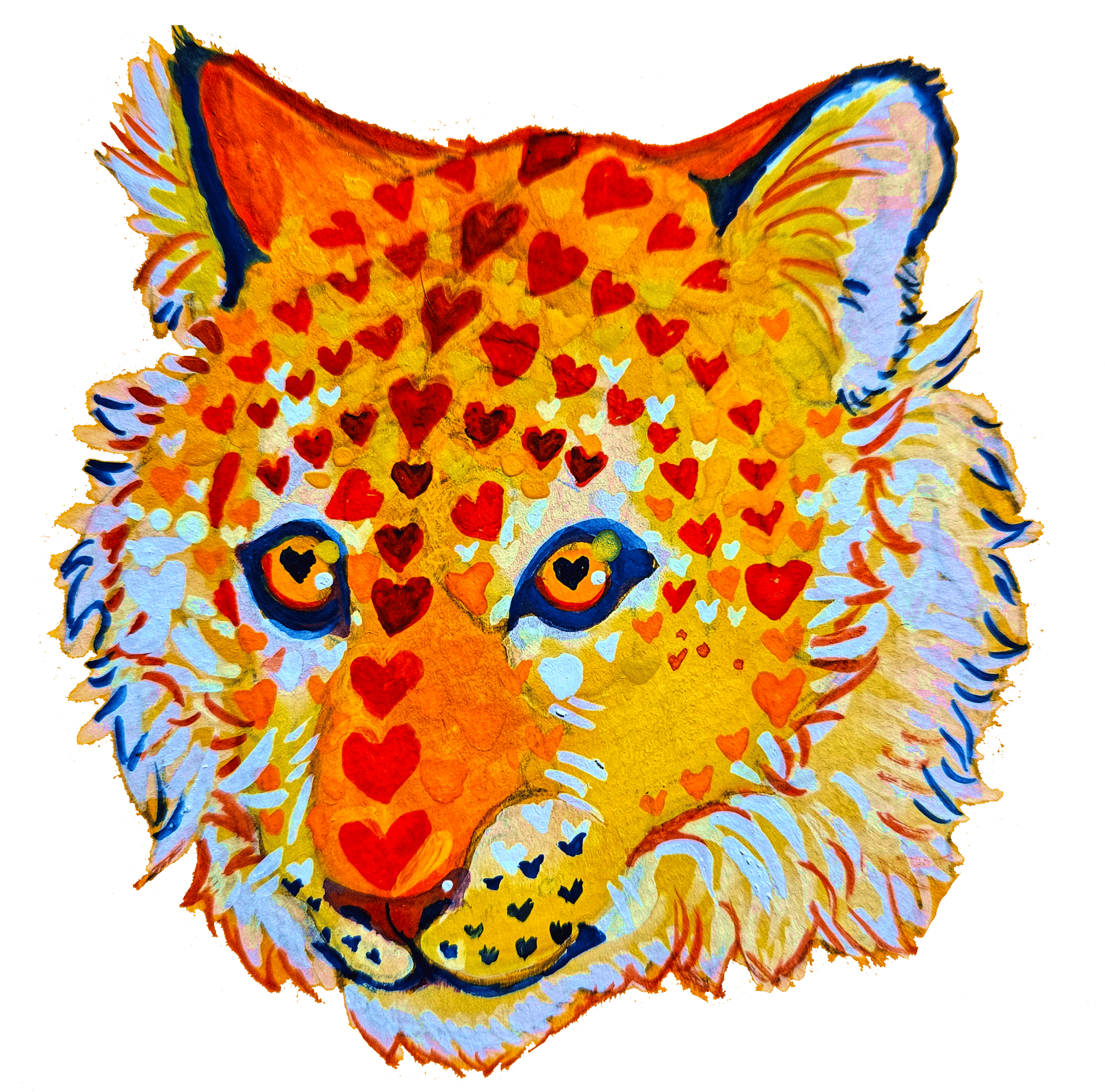 A 2.5'' vinyl sticker of a tiger with heart patterned stripes
